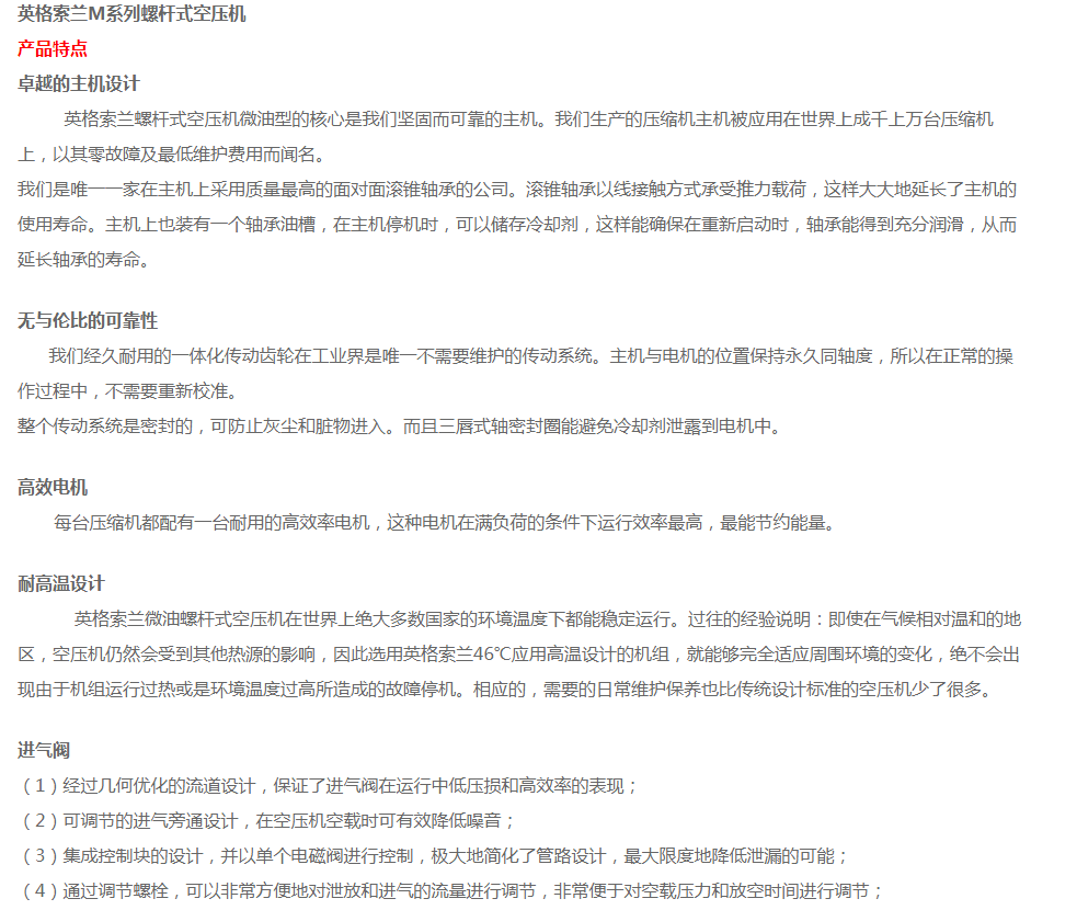 •        濟(jì)南銳博特機(jī)械設(shè)備有限公司是英格索蘭空氣壓縮機(jī)的授權(quán)代理商,代理銷售美國英格索蘭全系列的空壓機(jī)及后續(xù)處理設(shè)備。公司自成立以來,經(jīng)過公司全體同仁不斷努力,開拓創(chuàng)新,以優(yōu)良的技術(shù)、完善的售后服務(wù),使得公司贏得了一個又一個的誠心客戶。我公司擁有多名專業(yè)的銷售及售后服務(wù)人員,為客戶提供空壓系統(tǒng)的售前、售中及售后的全方位優(yōu)質(zhì)服務(wù)。另公司有多名具有英格索蘭壓縮機(jī)授權(quán)服務(wù)證書的服務(wù)工程師,能維修和保養(yǎng)國內(nèi)外各種品牌空壓機(jī),公司各種國內(nèi)外品牌空壓機(jī)配件庫存齊全。